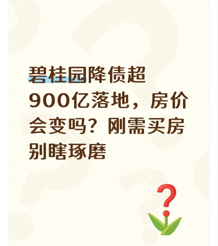 最近碧桂园的大事大家可能都听说了,境内外债务重组全落地,一下子降了超900亿债务,5年内不用愁集中还钱的事,融资成本也降到了1%-2.5%的低位,算是顺利“渡劫”了 。这事不光房企圈关注,咱们普通老百姓更关心:作为曾经的行业头部房企,碧桂园这么大动作降债,以后房价会涨还是跌?准备买房的刚需该等还是该入手?今天就用大白话跟大家捋清楚,每一点都跟咱们的买房计划实打实相关,不搞虚头巴脑的分析。