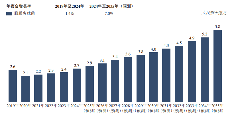 中国脑膜炎球菌疫苗市场呈现稳定增长态势。市场规模从2019年的人民币26亿元增至2024年的人民币27亿元,复合年增长率为1.4%。预计到2035年,市场规模将达到人民币58亿元,2024年至2035年的复合年增长率为7.0%。