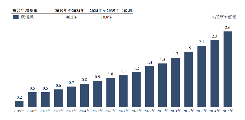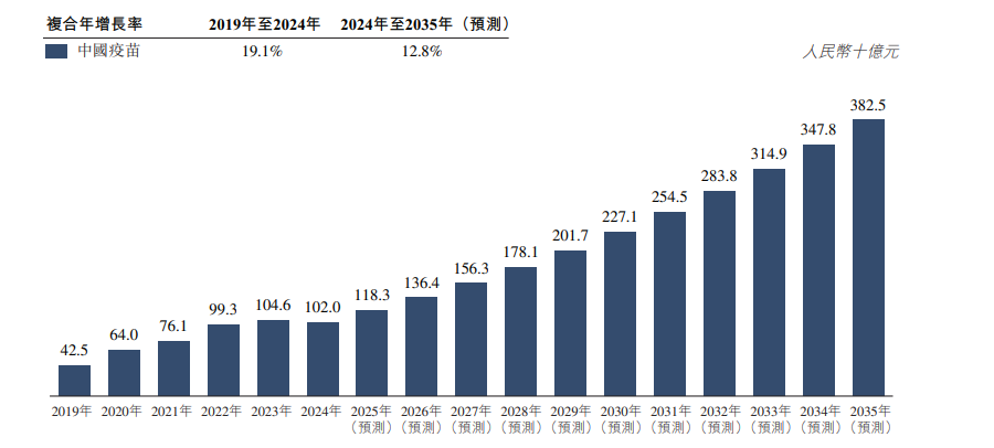 按销售收入计,中国疫苗市场规模(不包括新型冠状病毒疫苗)由2019年的人民币425亿元增长至2024年的人民币1,020亿元,复合年增长率为19.1%,预计到2035年将进一步增长至人民币3,825亿元,2024年至2035年的复合年增长率为12.8%。下图载列所示期间中国疫苗市场的历史及预估规模(不包括COVID-19疫苗):