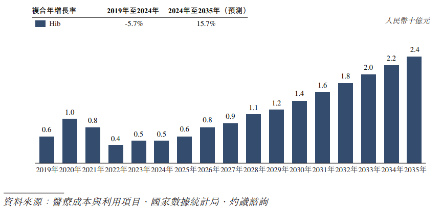 中国Hib疫苗市场预计将从2024年的人民币5亿元增至2035年的人民币24亿元,2024年至2035年的复合年增长率为15.7%。下图载列于所示期间中国Hib疫苗市场的市场规模: