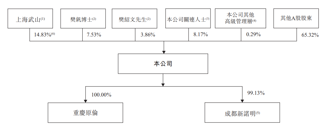 截至最后实际可行日期,上海武山由:(i)本公司董事长、执行董事兼总经理樊绍文先生持有约47.22%;(ii)本公司执行董事兼副总经理陈爱民女士持有约20.00%;(iii)独立第三方陈爱国女士持有约13.00%;(iv)副董事长兼执行董事樊钒博士持有约6.78%;(v)独立第三方邱宇谋先生持有约6.00%;(vi)独立第三方艾星先生持有约5.00%;及(vii)独立第三方李洪光先生持有约2.00%。樊钒博士为樊绍文先生的女儿。(i)泰昌集团;(ii)胡成先生,过去12个月为前董事;及(iii)执行董事陈爱民女士分别持有本公司约6.38%、1.64%及0.15%权益。泰昌集团由(i)非执行董事张鹏飞先生持有约54.00%权益;及(ii)独立第三方张宏靖先生持有约46.00%权益。