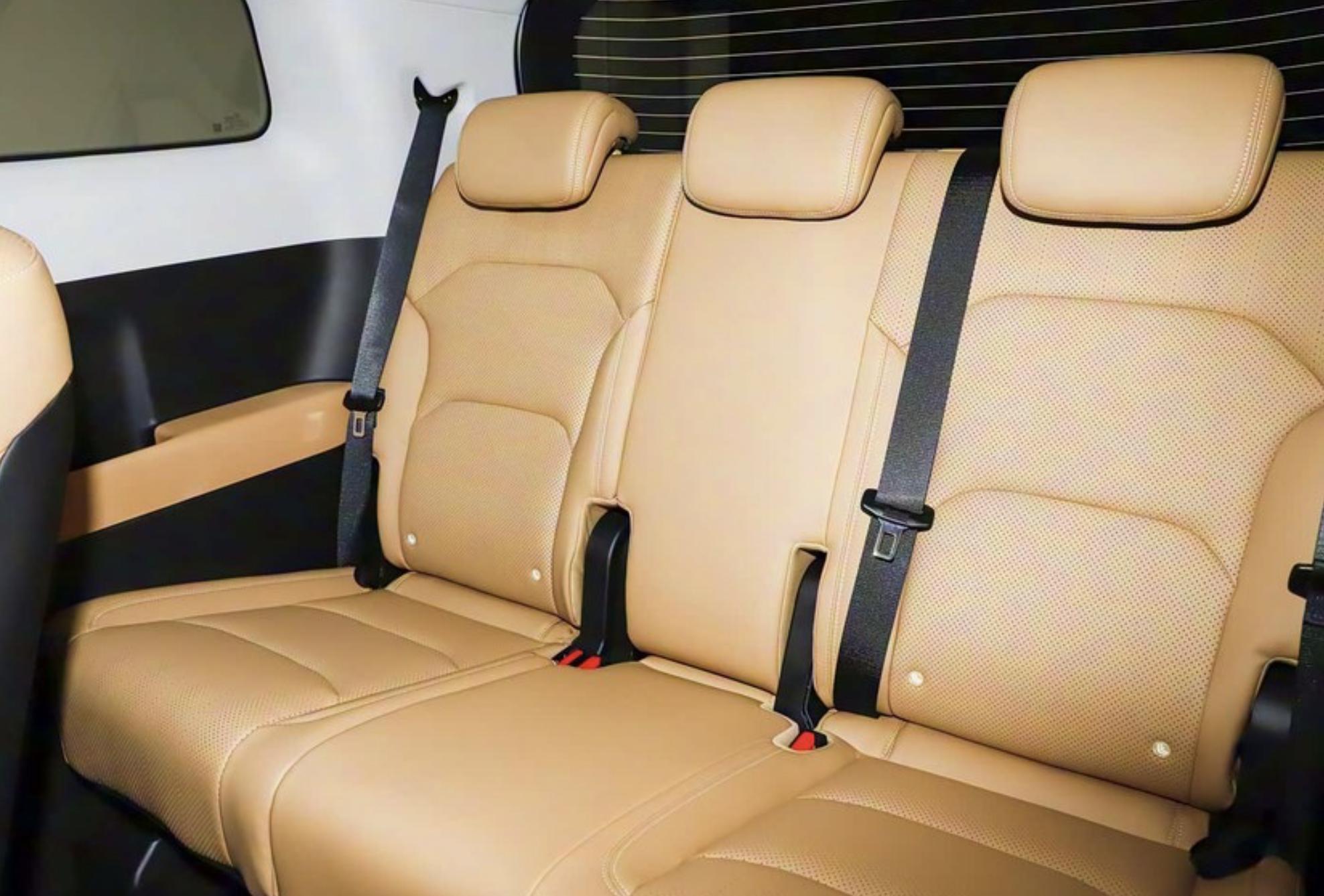 五菱星光L的车身也十分高大威猛,车顶配备了银色的全尺寸行李架车窗四周加入了银质装饰边框,黑色的B柱/C柱与全车黑色隐私玻璃融为一体,形成了鲜明的撞色对比,拥有不错的商务气息。车门采用了凹面的设计,拥有更多的灵动性,让庞大的车身不会太臃肿。四个门把手依旧采用了常规的设计,并自带无钥匙进入系统。车身迎宾踏板处加入了粗壮的银色镀铬元素,并与前后保险杠的银色饰板形成呼应。配备了20英寸的铝合金轮圈,匹配了235/55 R20规格的轮胎,毫无违和感。尺寸方面,该车的长宽高分别为4980/1930/1760mm,轴距为2950mm,并提供5座和6座可选。