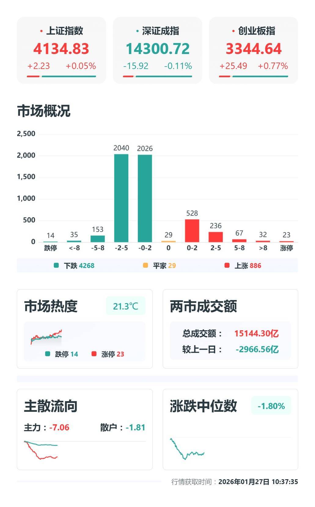 豪瑞优配 创业板指、沪指先后翻红!创业板指此前一度跌超1%,两市成交额较上日同一时间缩量近3000亿元 创业板 来源:股票配资门户网 网站:广源优配 日期:2026-01-27 10:39:00 查看:123