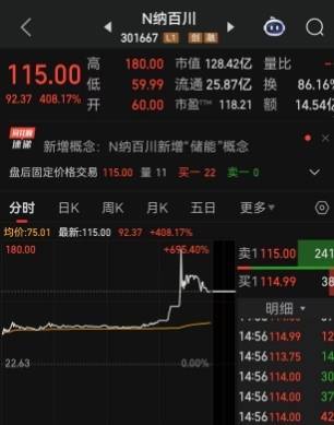 今日汽配企业纳百川正式登陆创业板,纳百川高开165.13%报60元/股,随后一直70元/股上下浮动,不过午后在A股三大股指下行后,无处可去的资金开始爆炒今日上市的纳百川,随后纳百川开始迅速拉升,14点左右纳百川触及78元/股,涨幅达到244.7%,触发第一次临时停牌,随后14点13分,纳百川涨幅扩大至324.2%,触发第二次临时停牌,再次复牌后纳百川继续疯狂上涨,最高触及180元/股,涨幅达到695.4%,数天前沐曦股份疯狂一幕再次上演。