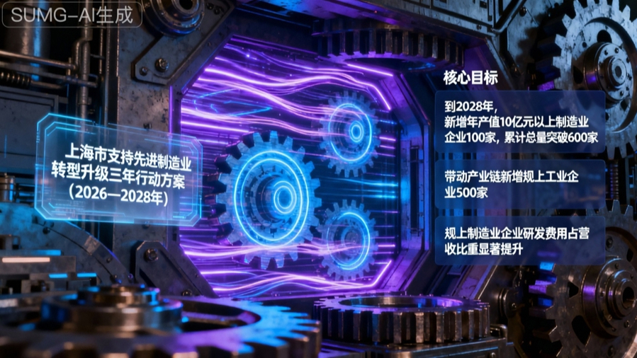 近日,《上海市支持先进制造业转型升级三年行动方案(2026—2028 年)》发布,明确以构建先进制造业为骨干的现代化产业体系为目标,推动大中小企业协同融通发展,其核心发展目标:到2028年,新增年产值10亿元以上制造业企业100家,累计总量突破600家;带动产业链新增规上工业企业500家,同时实现规上制造业企业研发费用占营收比重显著提升。