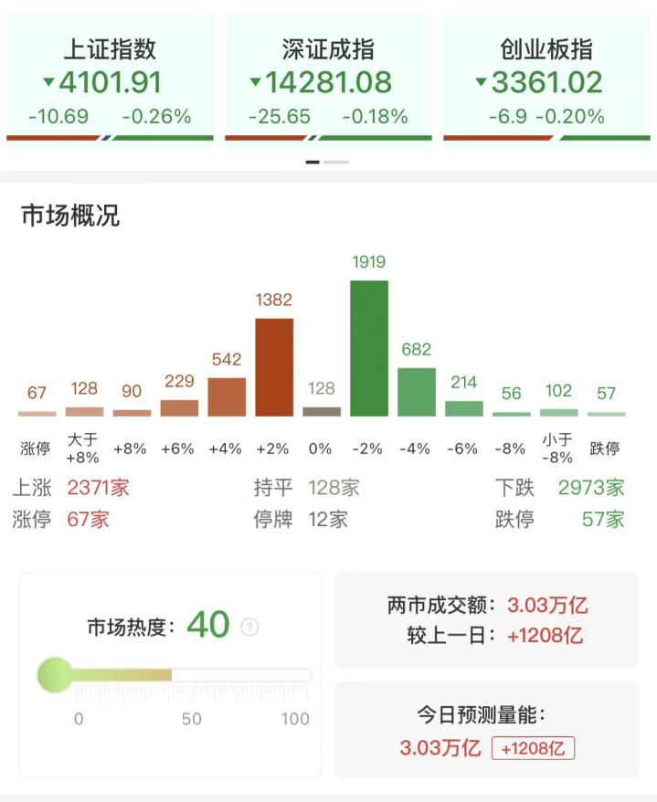 财联社1月16日讯,市场高开低走,三大指数集体收跌。沪深两市成交额3.03万亿,较上一个交易日放量1208亿。全市场超2900只个股下跌。从板块来看,半导体产业链集体走强,长电科技涨停创5年多新高,美埃科技、康强电子、圣晖集成涨停。存储芯片概念午后持续拉升,佰维存储、江波龙均创历史新高。人形机器人概念走高,五洲新春、方正电机等多股涨停。电网设备概念表现活跃,思源电气、广电电气涨停。下跌方面,油气、AI应用等板块跌幅居前。其中AI应用端遭遇跌停潮,新华都、天下秀、引力传媒、视觉中国跌停。截至收盘,沪指跌0.26%,深成指跌0.18%,创业板指跌0.2%。