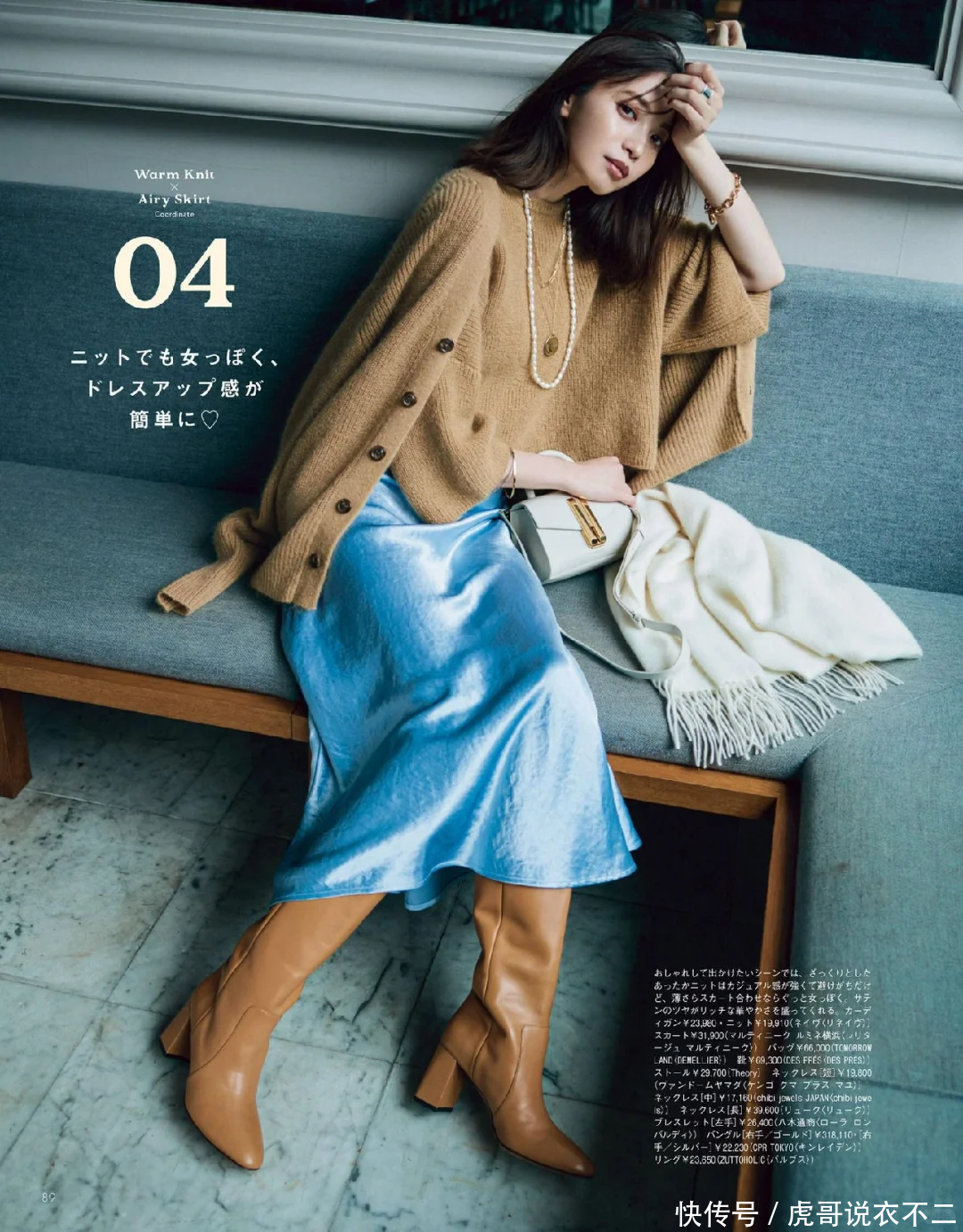 咖啡色毛衣与蓝色半身裙的组合也非常的绝,选择咖啡色长筒靴与毛衣色彩相呼应,再套一件灰色长款大衣,那种温柔中透露出小清新的气质,相信没有哪个女人会拒绝。