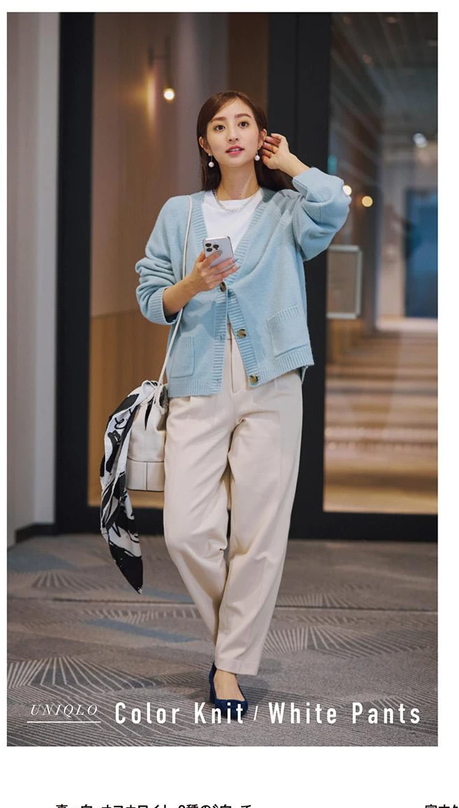 蓝色系针织开衫也非常实用,无论是当外套来穿或者是用于内搭叠穿,蓝色系开衫都非常百搭,搭配白色裤装,清新高级而且非常的衬肤色。