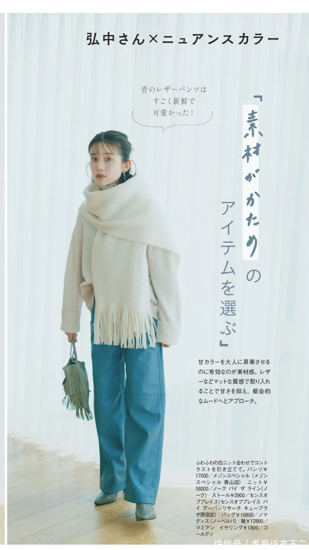 蓝色裤装同样推荐浅色系,与白色毛衣搭配简约高级又温柔,在日杂模特的穿搭中,这种搭配模式非常多,比如宽松的毛衣或者卫衣搭配浅蓝色休闲裤或者烟管裤,就算是冬季也可以搭配灰色大衣,非常的时髦且实用。