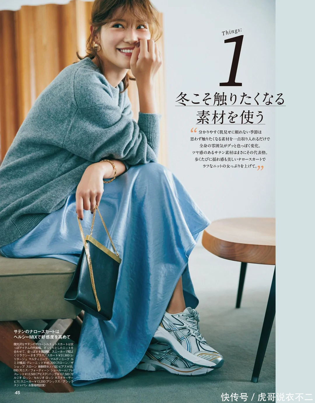 如果选择深色系的蓝色半身裙,推荐与灰色单品组合,作为最有高级感的颜色,灰色系可以很好的压制蓝色带来的视觉冲击感,比如这套灰色大衣内搭浅灰色毛衣,下半身搭配深蓝色半身裙,温柔中透露着高级感,减龄又时髦。