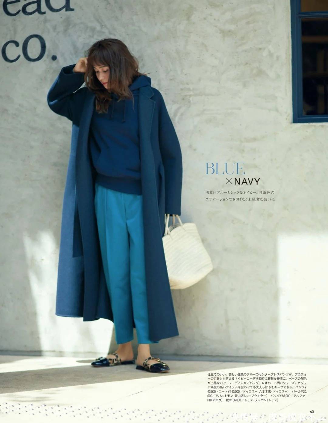 蓝色系单品用好了可以提升造型气质,但也要注意色彩的搭配,大面积的蓝色或者各种色系的堆积就会显得不伦不类,无论是单品组合还是色彩搭配,都应该讲究简繁结合才能穿出好气质哦!
